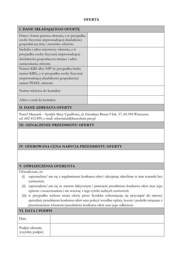 4. Oferty należy składać do dnia 6 marca 2026 r., z tym zastrzeżeniem, że we wskazanym terminie oferta musi wpłynąć do biura Syndyka lub na adres poczty elektronicznej Syndyka (decyduje data wpływu a nie data nadania oferty).